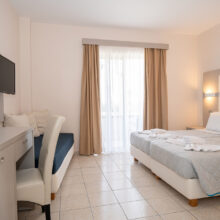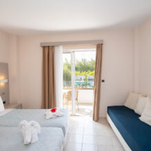 The Triple Room with Garden View is ideal for families or small groups seeking spacious and comfortable accommodation in Kos. This 23 m² room features three twin beds and a private balcony overlooking the hotel’s lush gardens or swimming pool area.