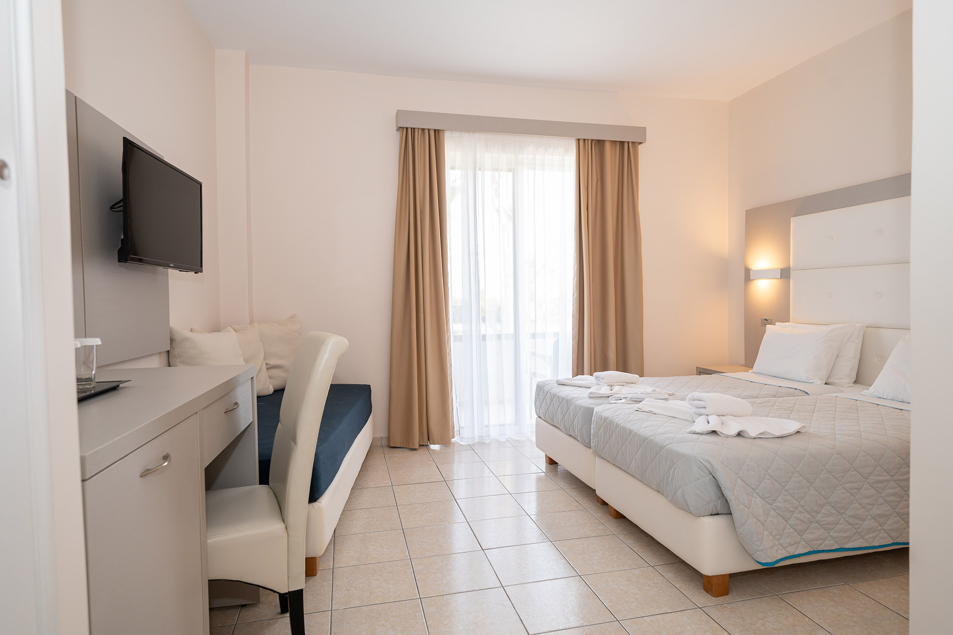 The Triple Room with Garden View (23 m²) features three twin beds and a balcony overlooking the gardens or pool. Bright and comfortable, with air conditioning, free WiFi, and essential amenities. Perfect for families or small groups seeking a relaxed stay just steps from the beach.